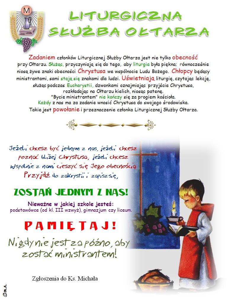 Zapraszamy na cotygodnoiwe spotkania: – formacyjne: poniedziałek godz. 17.00 (ministranci), godz 18.40 (lektorzy) – rekreacyjne: piątek godz. 18.40